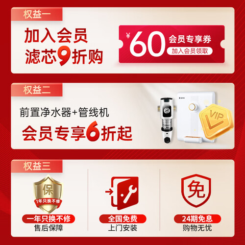 具备6000L的总净水量,滤芯使用寿命长,净水成本低。带有集尘复合滤芯,吸附异味异色,出水口感好。