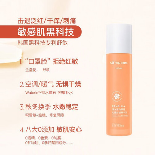 不添加酒精等刺激性成分,质地清润易吸收,不会给敏感肌造成任何伤害。山茶花精粹,在舒缓肌肤敏感的同时还能强韧肌肤屏障。