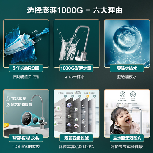 1000G澎湃大通量,2.2L/min大流量,煮饭煲汤用水量快速到位,更少等待,饭菜更快上桌。一级水效,节水环保又省钱。