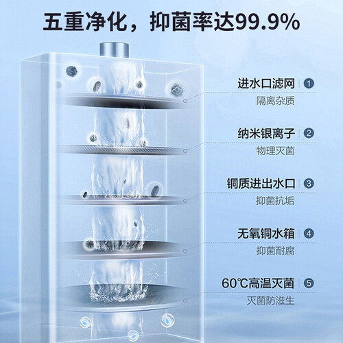 配置五重净化系统,帮助净化水质,守护家人沐浴健康。智能防冻技术处理,拒绝水箱水管冻坏,运行更加可靠。