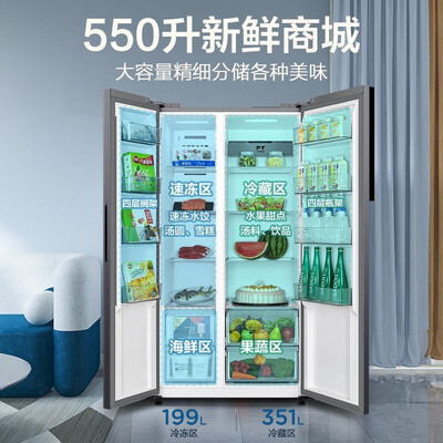 550L大容量的存储空间,冷冻冷藏精细分储,储鲜随心不串味。搭载品质双变频,节能环保,轻音低噪不扰眠。