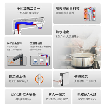 600G澎湃大流量,鲜活纯水,满足全家一天饮用水需求。航天净菌黑科技,有效吸附水质杂质,改善水体口感,呈现入口清甜。