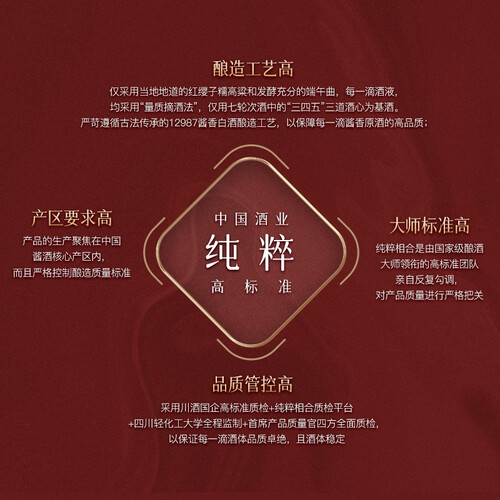 采用7年的典藏基酒,经过12987传统工艺酿制,让酒体的品质更非凡。加入15年的老酒调味,丰富酒体口感,入口更醇厚。