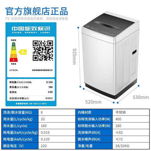 采用8kg大容量设计,轻松洗净大件换季衣物,减少送去洗衣店的烦恼。搭载降噪设计,运行声音小,静谧洗护时光。