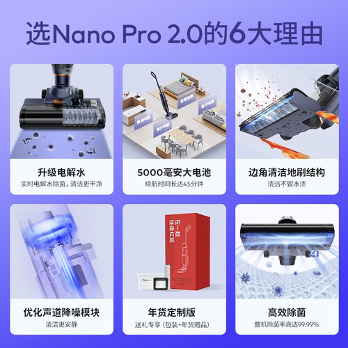 搭载电解水除菌技术,安全健康无异味,让你可以放心使用。内置无刷电机,性能强劲,吸力强度和稳定性得到了进一步提升。