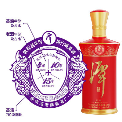 源自酱酒黄金产区-赤水河畔老牌酒,适合微生物生长发酵,产出的酒品质纯正。坤沙工艺,用曲量大,所含各种元素丰富,口感醇和。