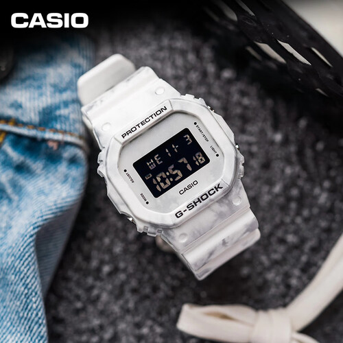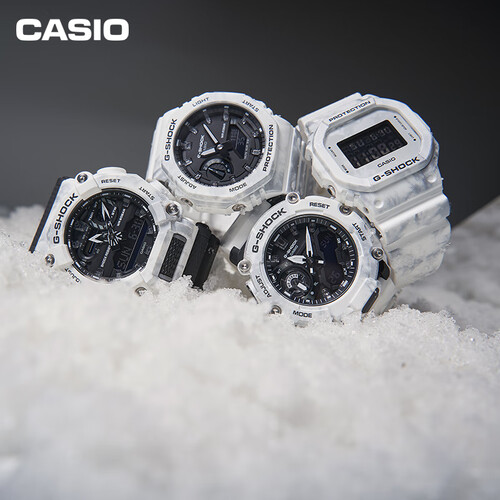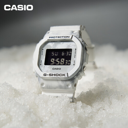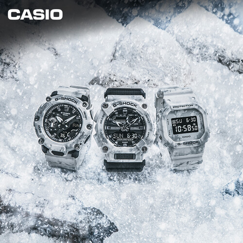 表款整体施以雪花迷彩花纹,冬日意蕴立显。复古风格的方形表盘在黑色反显液晶显示屏的映衬下,坚韧魅力彰显,凸显硬核时尚气场。