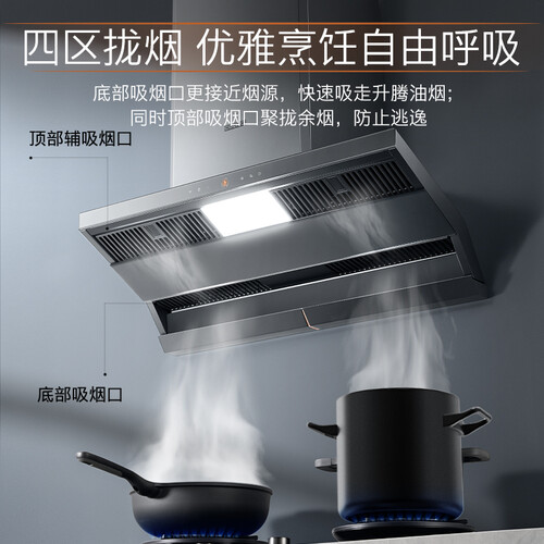 底部设有进烟口,更接近烟源,可在油烟未升腾扩散前吸走油烟。直流变频巡航增压,烹饪高峰畅排无忧。