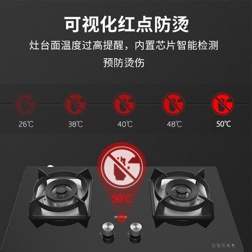 灶台表面设计有可视化红点,当温度过高时,颜色会加深,避免被烫伤。搭载全进风设计,带来更为强劲的大火力。