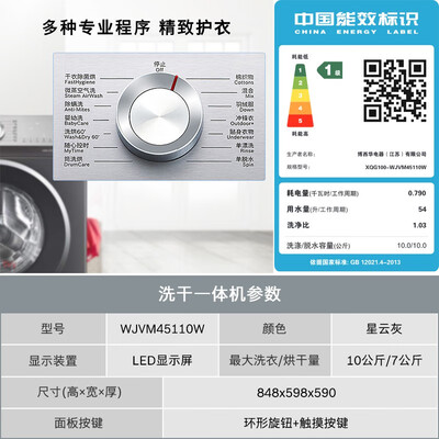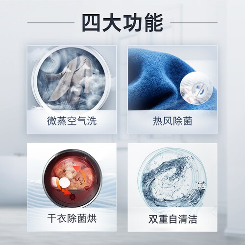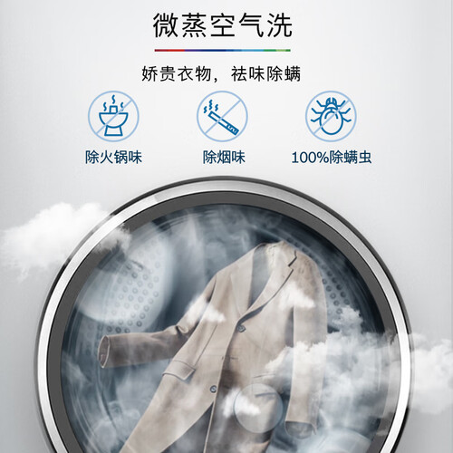设有蒸汽空气洗功能,深度呵护娇贵纤维,去除衣物异味。搭载德国智控速烘技术,实现均匀烘干效果,衣物蓬松亲肤。