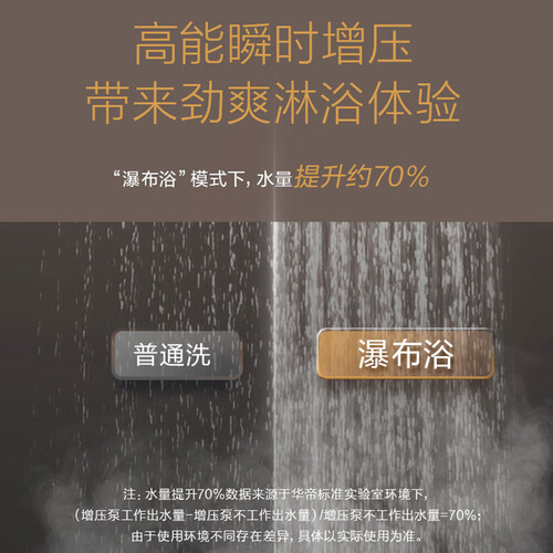 单管预热,能快速响应,大幅缩短了预热时间,同时也能节省燃气。高能瞬时增压,水量瞬间提升70%,能享受瀑布浴。