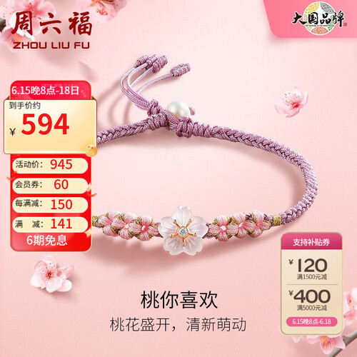 玉髓钻石搭配18K金材质,纹理细腻丰富,创造出生动逼真的桃花造型;手工编织手绳再点缀珍珠,满满细节感,适合情人节送女友。