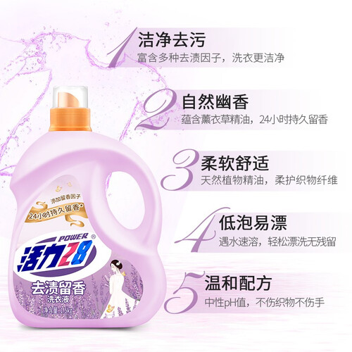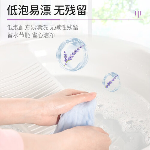 蕴含薰衣草精油,可以保证24小时长时间的留香效果,让你一整天都散发魅力香气,低泡易漂洗,遇水溶解污渍,更快更干净。