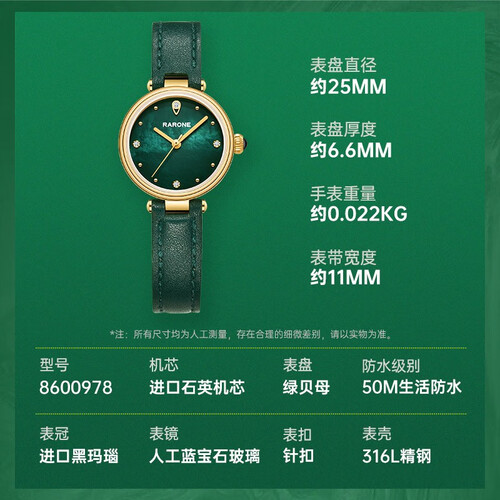 雷诺小绿表采用色泽浓郁的绿色贝母设计,日常佩戴更显动人,满足女友时尚搭配。结合意大利进口牛皮表带,皮质柔韧亲肤。