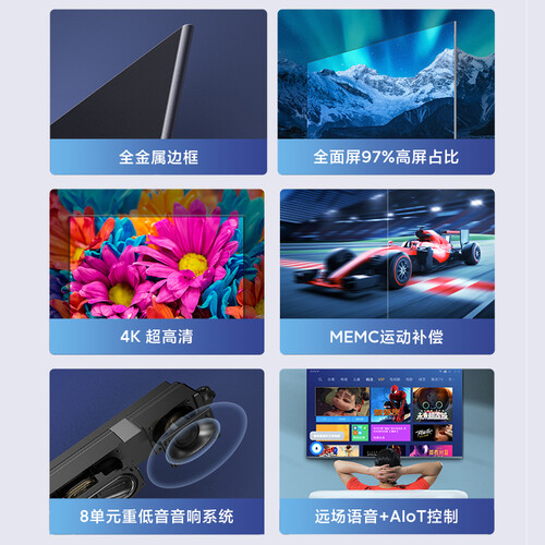 选用超薄全面屏搭配金属边框,使机身更加纤薄,客厅摆放更显质感与品味,搭配小爱音响体验感更加便捷。