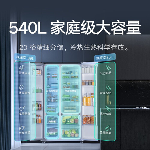 臻彩触控大屏设计,开启智能化生活,各种信息一目了然。540升超大容量,轻松囤积一周食材,避免频繁采购。