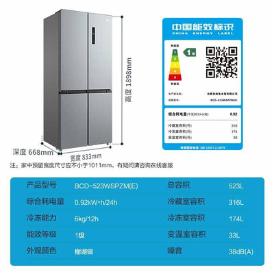 523升大容量,收纳更多的食材,一周无需去超市。风冷无霜技术,无需手动除霜,果蔬水分不会太快流失。