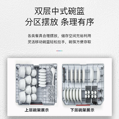 12套大容量设计,轻松装下88件餐具,亲朋聚会锅碗都能洗解放了双手。双层碗篮,各类餐具分区摆放,碗筷存取更方便。