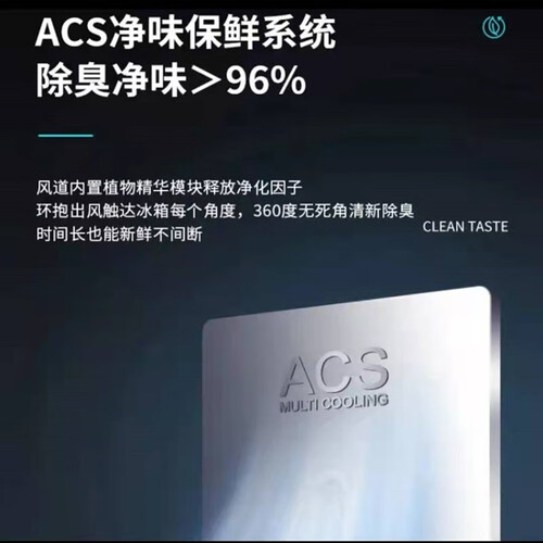 ACS净味保鲜系统,快速去除异味,营造更加清新的储存空间。360°环抱出风口,冷风均匀包裹食材,防止风干,保鲜时间更长。