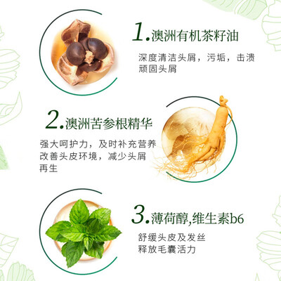 内含有机茶籽油成分,能深层清洁头皮污垢,远离头屑困扰;加入了薄荷醇等成分,有效舒缓头皮,给发丝增加活力。