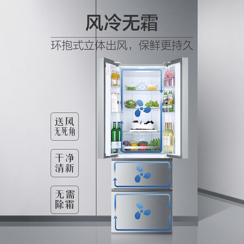 采用了三温区设计,方便分类存储食物,告别异味或串味。利用风冷技术快速制冷,可避免仓内结霜,不必再反复凿霜。