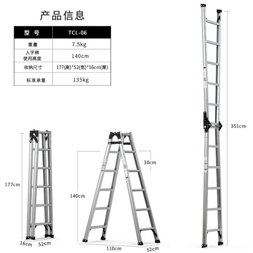 高强度铝合金材质,具有抗压抗弯的效果,使用寿命长,不易变形,且踏板防滑效果佳,踩踏更加安全,稳健上梯。
