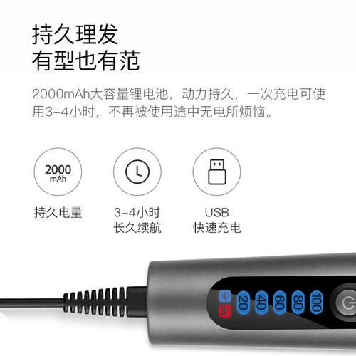 机器运行动力澎湃,理发效率更高,搭配一键加速设计,轻松清理粗硬发质。大容量锂电池,续航时间持久,理发不易被电量打断。