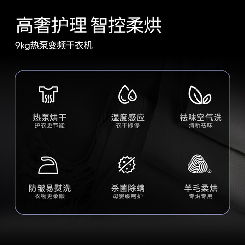 拥有9公斤大容量,大件衣物轻松洗涤,满足大家庭的使用需求。热泵低温柔烘,贴心守护娇贵的衣物,带来安心的烘干体验。