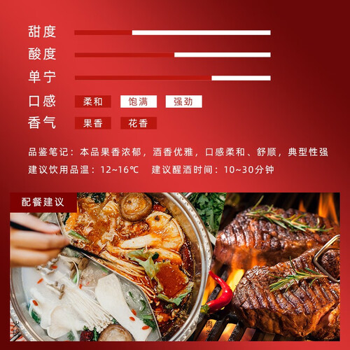 挑选优质的赤霞珠葡萄为原料,经过发酵,充分的释放出浓郁的果香味道。橡木桶陈酿,去除酸涩味道,口感更加纯正顺滑。