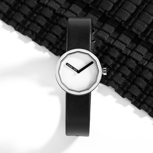 黑色的皮质表带,搭配白色调的表盘,醒目吸睛,别具美感。无数字刻度设计,非常的简洁大方,彰显时尚气息。