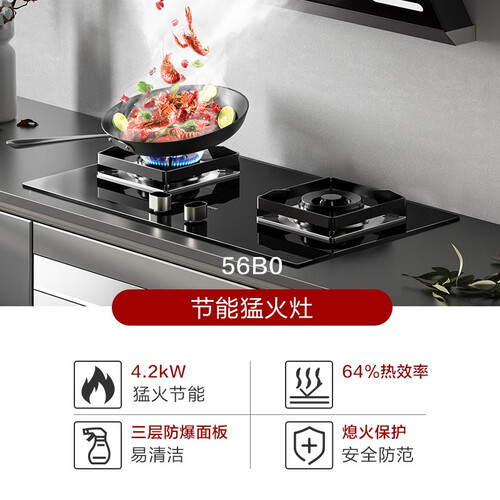 面板使用钢化玻璃材质,坚固耐高温且方便清洗。4.2KW的大火力加上百分之63的热效率,节能省气的同时爆炒也不在话下。