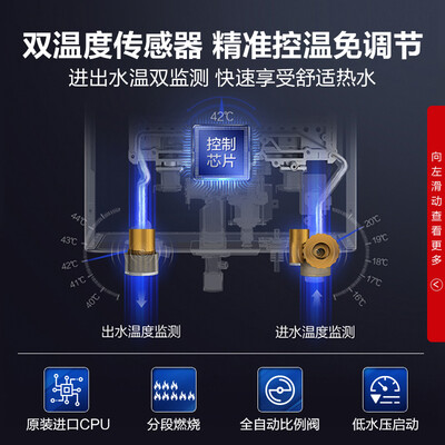 搭载全自动比例阀设计,精准控制燃气供给,体验零温差的舒适沐浴。低水压启动技术,高层老房也能轻松使用。
