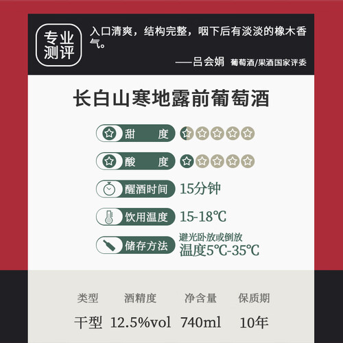 源自长白山葡萄,颗颗成熟饱满,单宁适中。具有出色的葡萄果香,口感酸甜适中,易被初学者接受。