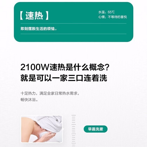 2100W大功率速热,快速加热,畅快沐浴,满足全家日常热水需求。加长防电墙,有效解决漏电隐患,守护家人沐浴安全。