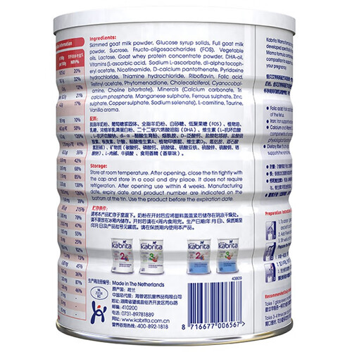 荷兰原装进口的孕妇羊奶粉,添加叶酸、膳食纤维、钙、铁、维生素D等营养,满足胎儿发育需求。