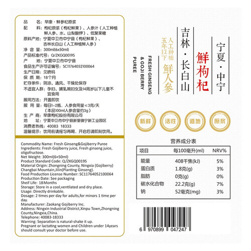 早康 鲜参杞原浆饮料