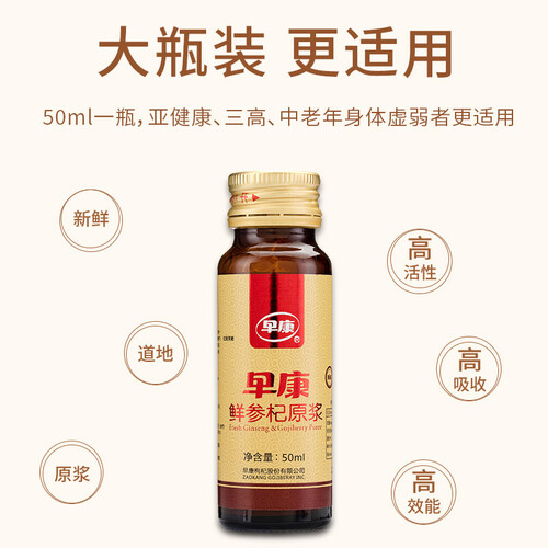 新鲜的人参和枸杞原料,现代科学技术搭配黄金比例压榨而成,补充人体营养,提升免疫力。无添加成分,饮用更健康。