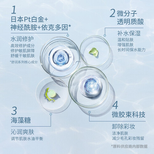 成分致简,蕴含Pt白金微粒,令肌肤持久保持水润光泽感。温和配方,敏感肌也适用。特别添加海藻糖,可使肌肤清爽不紧绷。