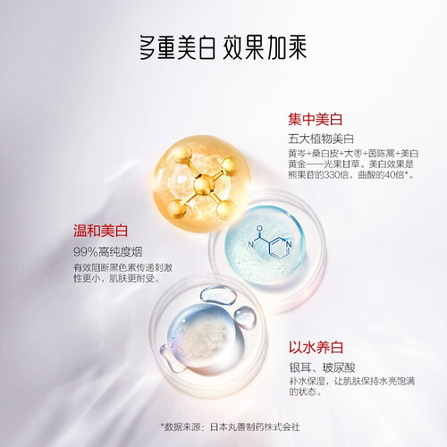 内里含有烟酰胺成分,促进黑色素角质脱落,细致焕亮暗沉肤色。玻尿酸成分保湿补水,令肌肤更加嘭弹有活力。
