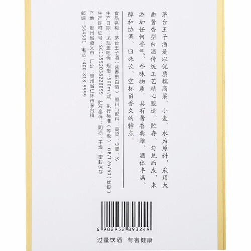 王子珍品酒,酱香酒中的典范,酒色清亮透明,酒体丰满醇厚。入口感觉馥郁醇香,绵柔清冽,复合香味协调又具有层次。