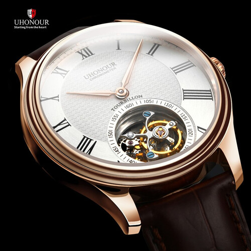 表盘上面设计有了圆形小窗,可以展现出机械走动的美感。搭载走时精准的陀飞轮机芯,动能储备可达40小时以上。