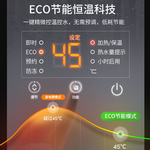 下潜式发热管的设计,与水接触面大,加热速度快,让你沐浴无需久等。具有ECO节能恒温科技,更省电省钱。