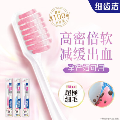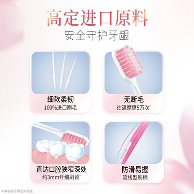 精选倍软极细绒毛,具有足够的韧性,既能清洁护理又能按摩牙龈。小巧的刷头设计,可深入口腔的各个角落,清洁不残留。
