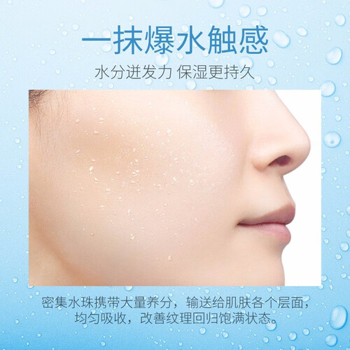 采用补水锁水配方,涂抹时分离的水分子能快速被肌肤所吸收,深入补水,并且迅速形成保护膜,帮助肌肤牢牢锁住水分。