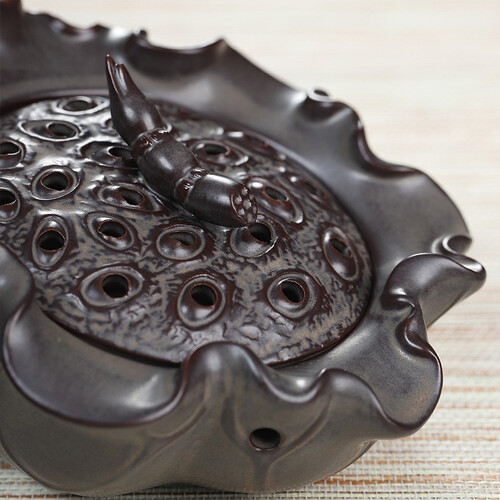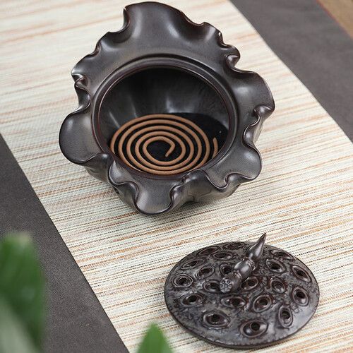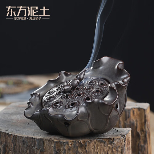 通过陶瓷烧制而成,呈荷花造型,充满古韵味。一炉多用,可在底部放盘香或在莲蓬上插上塔香,烟雾飘渺享受生活。
