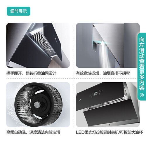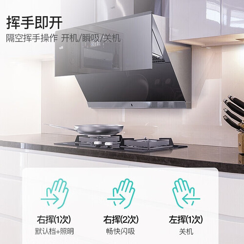 挥手智控功能,轻松控制风量与开关机,享受全新体验。劲吸爆炒风量,轻松应对双灶烹饪,油烟刚起瞬吸无踪。