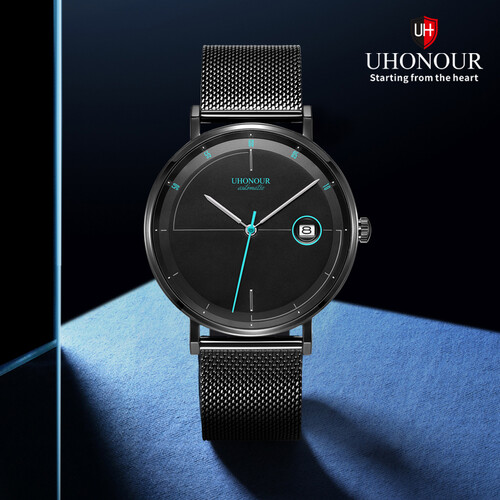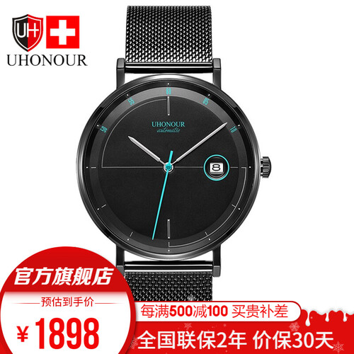 进口机芯,镀膜玻璃,全黑钢带黑面青针,表带金属质感十足,耐磨耐刮,圆形表盘优雅简约彰显非凡气质。