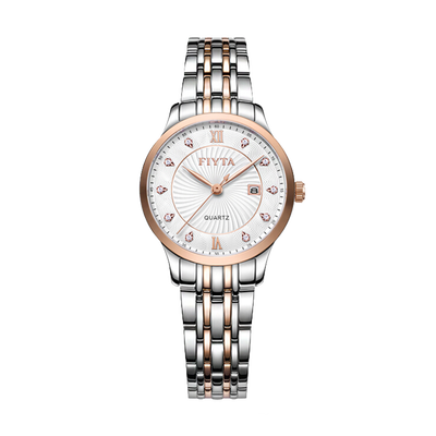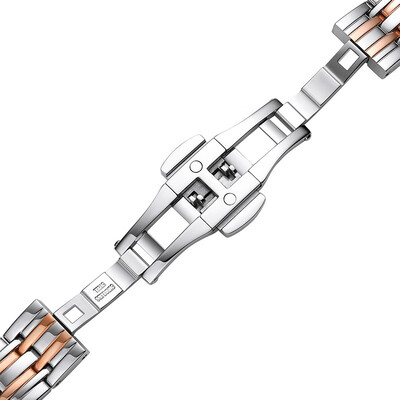 银色钢带上加入了间金设计,打造多层次的效果,字钉全部采用镶钻的方式,非常璀璨亮眼,石英机芯,经久耐用。