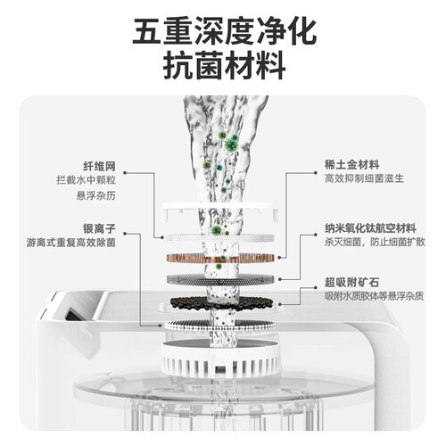 内置高效双重净化系统,深层净化水质,贴心照顾敏感人群。顶部加水设计方便快捷,加水不易滴漏。