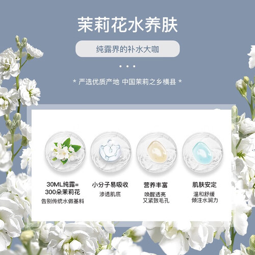 添加了茉莉花水做基料,小分子的结构能够帮助肌肤很好吸收,达到深层补水的功效。还添加了角鲨烷,更加亲肤,能有效修护屏障。